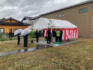 優しい雨が降り注ぐ中、I様邸の地鎮祭が執り行われました。